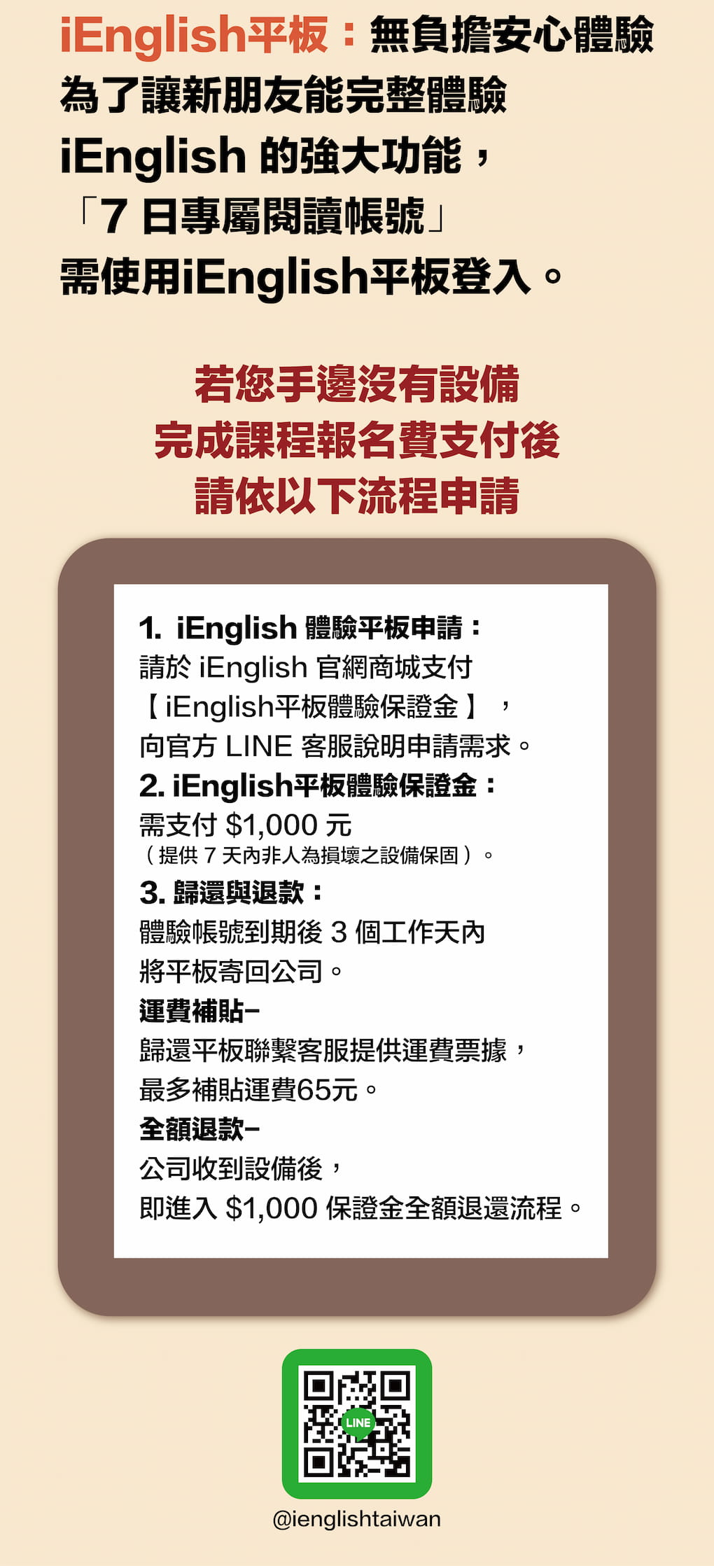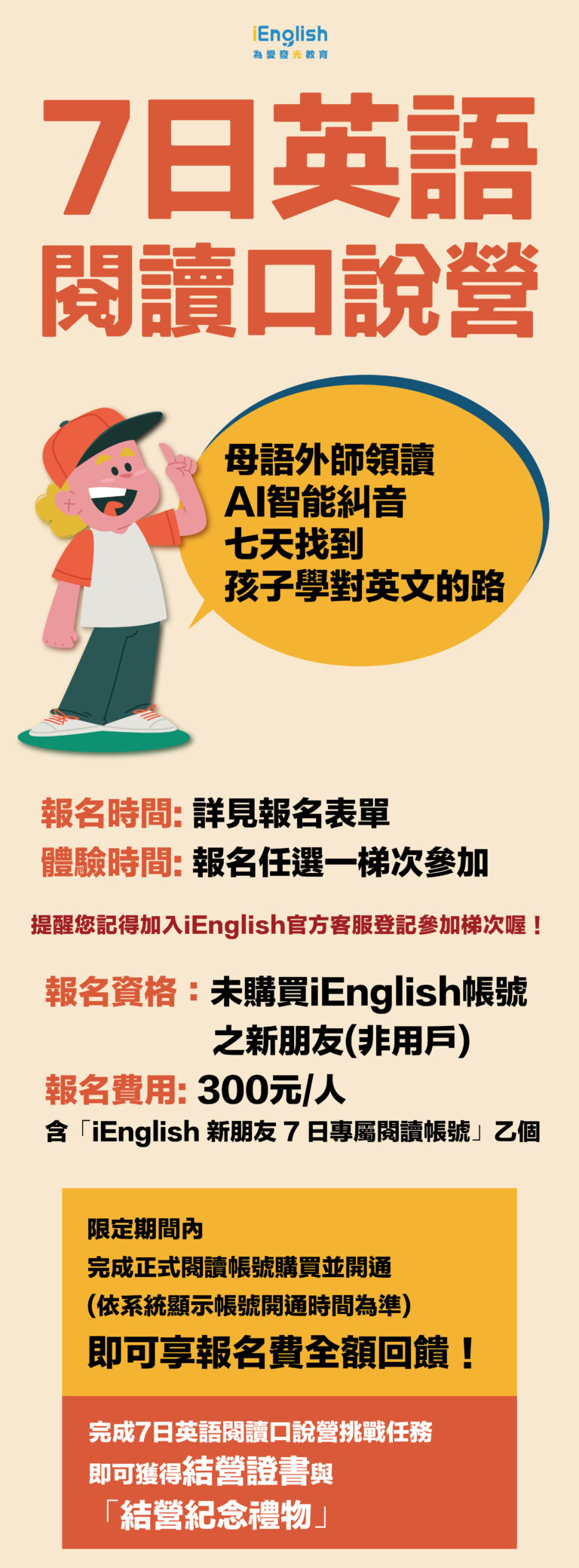 💡報名費用: 300元/人,含「iEnglish 新朋友7 日專屬閱讀帳號」乙個