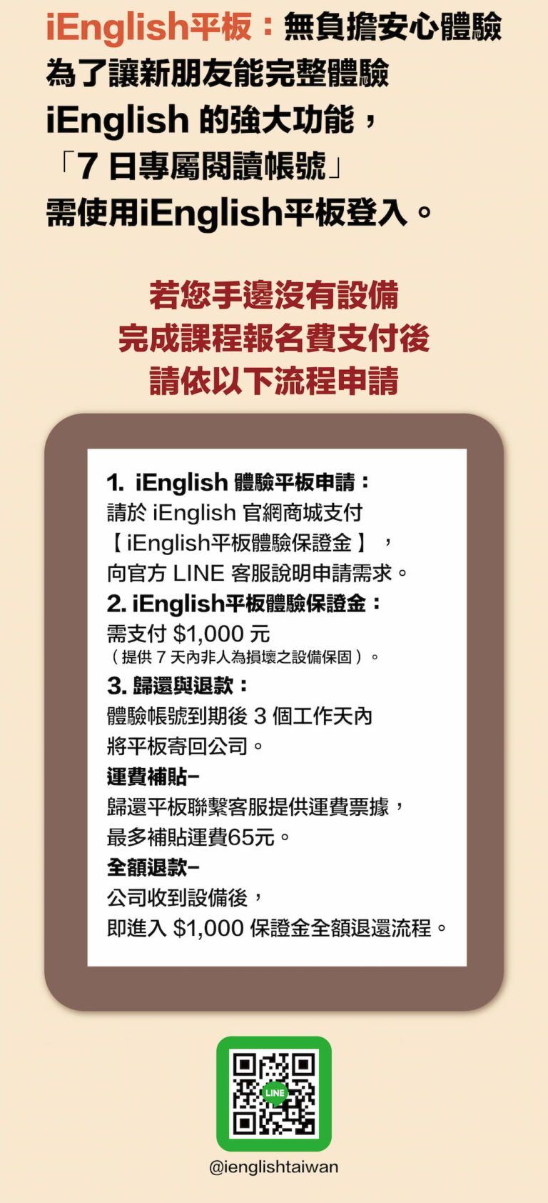 1. 「iEnglish 新朋友7 日專屬閱讀帳號」,會於體驗梯次開始前透過官方LINE客服提供給家長,使用時可以借用朋友的小 i 平板或是提前向客服申請「官方體驗機」。